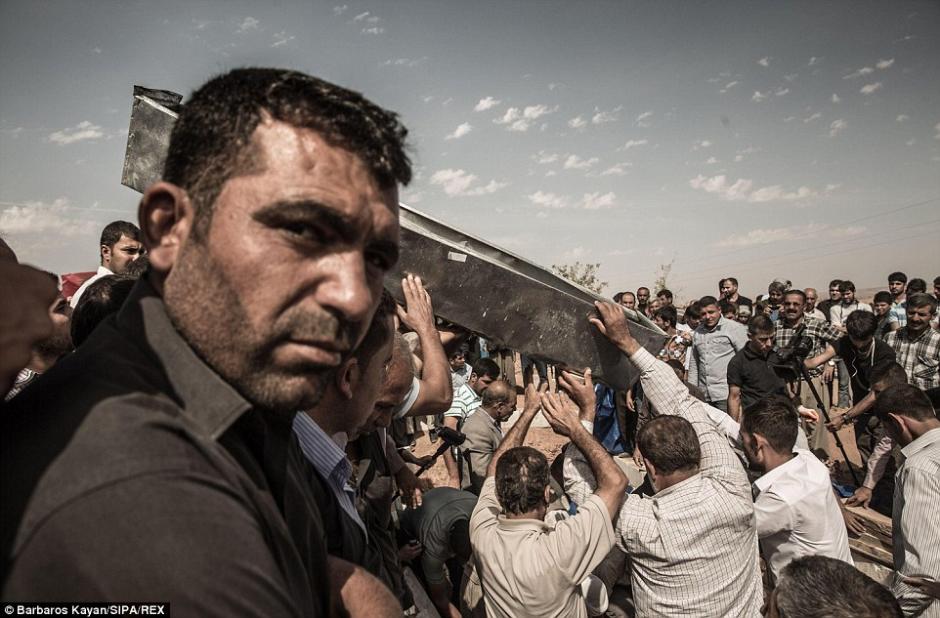 据《每日邮报》报道,当地时间2014年10月9日,3名库尔德战士在抵抗叙利亚极端武装的战斗中牺牲,悲痛的民众为3名勇士举行葬礼。图为村民埋葬在战斗中牺牲的战士。(网页截图)