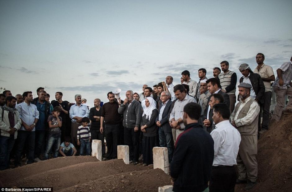 据《每日邮报》报道,当地时间2014年10月9日,3名库尔德战士在抵抗叙利亚极端武装的战斗中牺牲,悲痛的民众为3名勇士举行葬礼。图为数百名村民为库尔德战士送行。(网页截图)