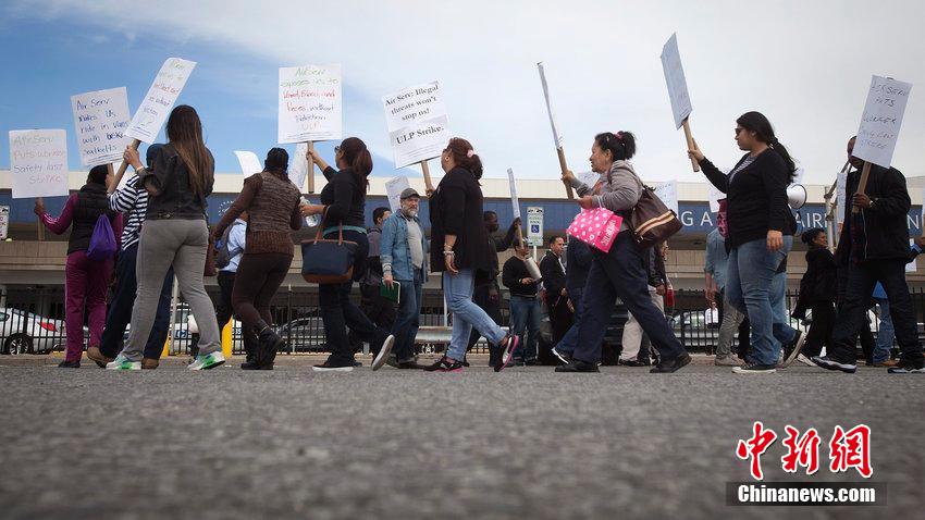 当地时间2014年10月9日,美国纽约,近200名机舱清洁工因健康安全问题举行罢工,抗议可能接触到埃博拉病毒。这些清洁工日常工作能够接触到旅客的体液和废物。图片来源:CFP视觉中国