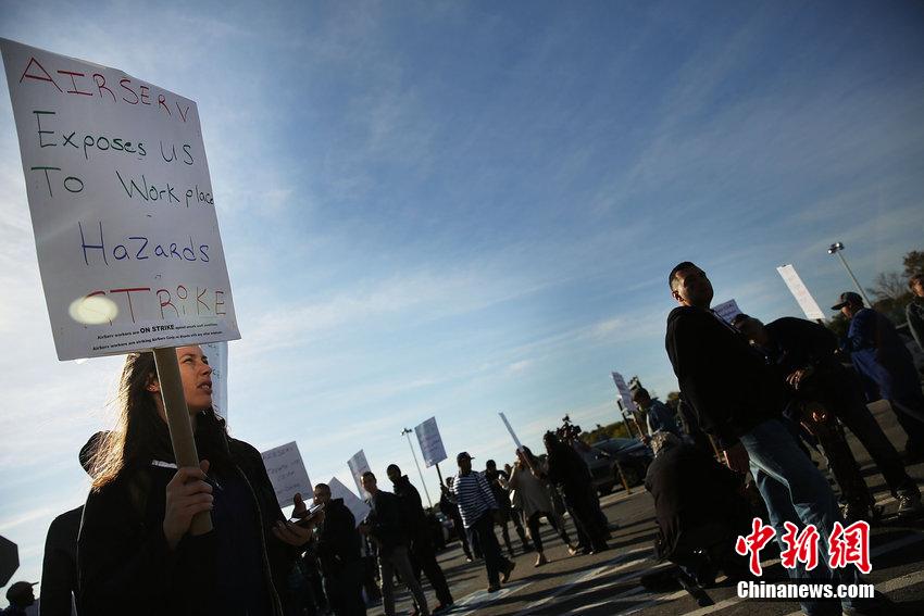 当地时间2014年10月9日,美国纽约,近200名机舱清洁工因健康安全问题举行罢工,抗议可能接触到埃博拉病毒。这些清洁工日常工作能够接触到旅客的体液和废物。图片来源:CFP视觉中国