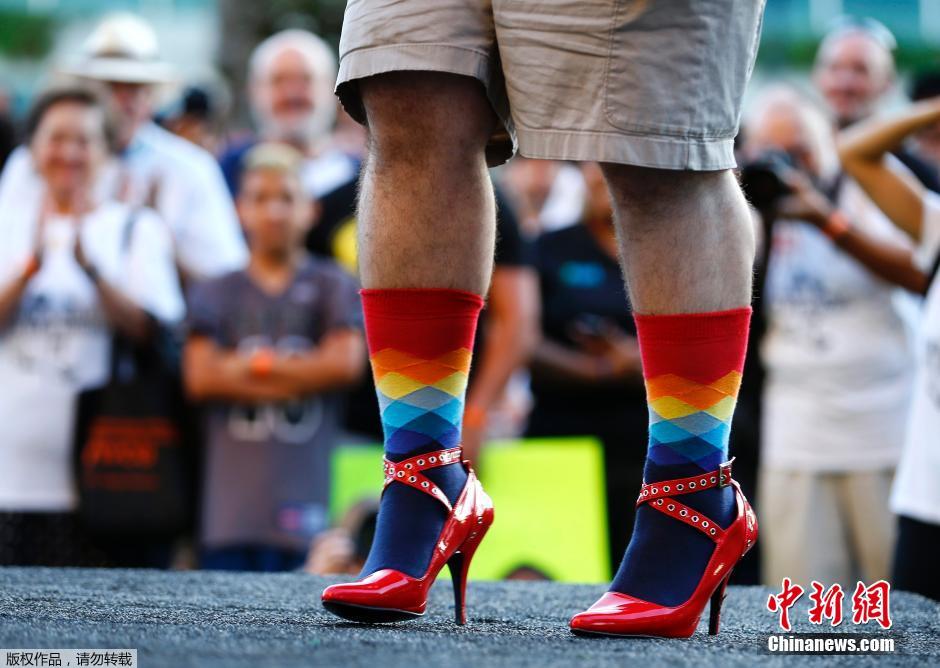 当地时间10月10日,美国圣地亚哥,男人穿上细高跟鞋像女人一样穿过市中心,这项“穿高跟走一英里”的活动,让男人体会一把做女人脚踩高跟走路的艰辛,旨在有助于避免圣地亚哥的家庭暴力事件的发生。