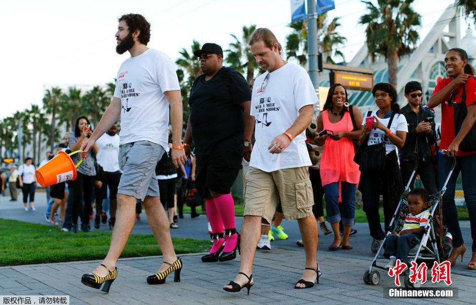 当地时间10月10日,美国圣地亚哥,男人穿上细高跟鞋像女人一样穿过市中心,这项“穿高跟走一英里”的活动,让男人体会一把做女人脚踩高跟走路的艰辛,旨在有助于避免圣地亚哥的家庭暴力事件的发生。