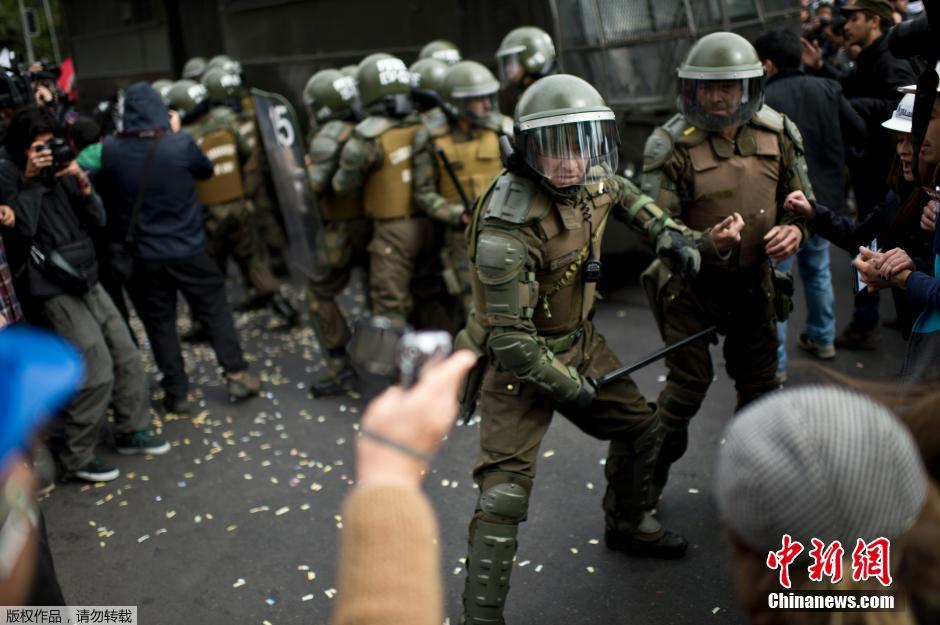 当地时间2014年10月9日,智利圣地亚哥,学生举行示威活动要求教育免费,游行活动愈演愈烈,并与警方对峙发生激烈冲突。