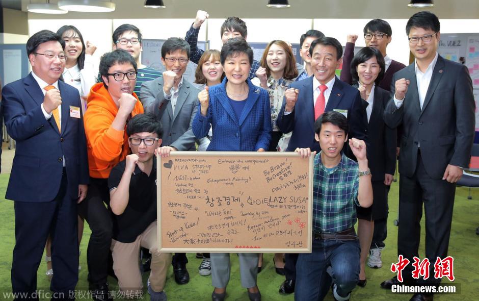 当地时间2014年10月10日,韩国大田,韩国总统朴槿惠前往大田儒城区韩国科学技术院,出席创造经济革新中心成立仪式。朴槿惠拿自拍杆与有为青年、风险企业家们合影。图片来源:东方IC 版权作品 请勿转载