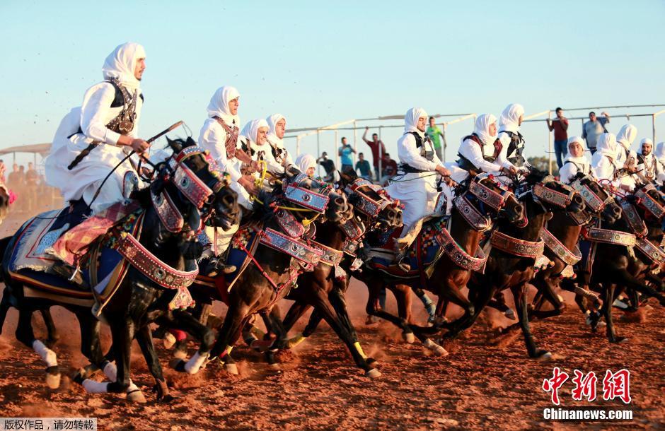 当地时间10月10日,班加西,利比亚马术节开幕,马棋手穿着传统服饰参加比赛,场面十分壮观。