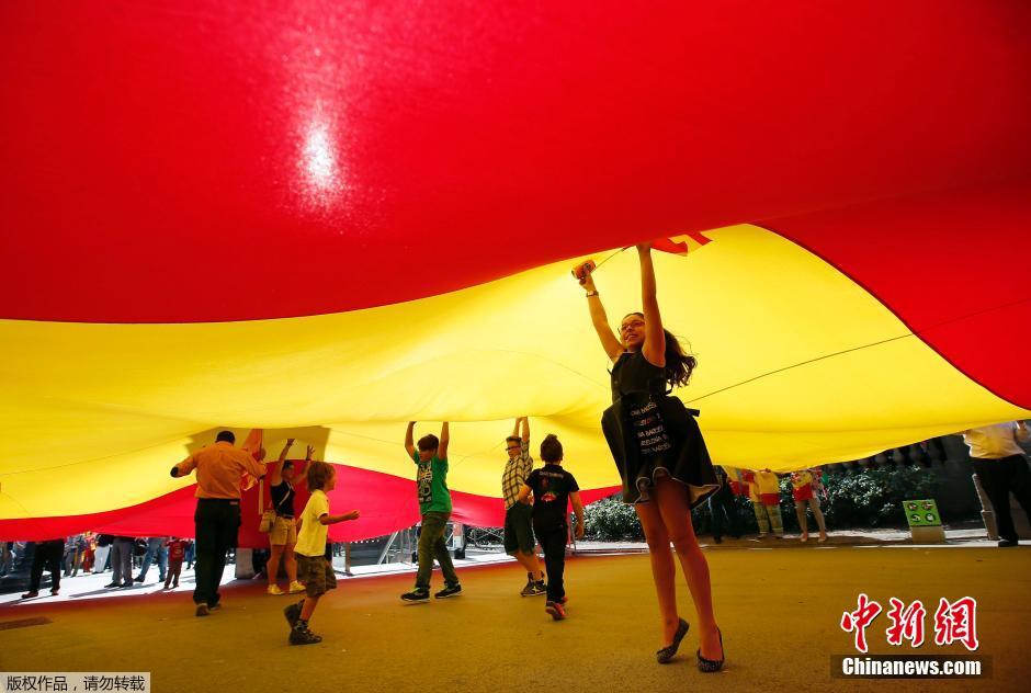 当地时间2014年10月12日,西班牙国庆日,民众在巴塞罗那举行游行活动,反对加泰罗尼亚独立祈求统一。
