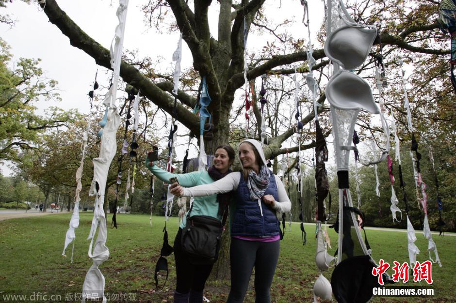 当地时间2014年10月11日,荷兰阿姆斯特丹,当天为“国际女童日”当地瓦代尔公园公园一棵树上挂满了文胸。2011年12月19日,联合国大会通过66/170决议,宣布10月11日为国际女童日。图片来源:东方IC 版权作品 请勿转载