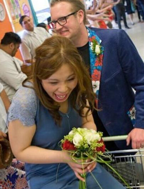 婚礼结束后,卡斯佩尔将珍妮弗抱上购物车离开超市。