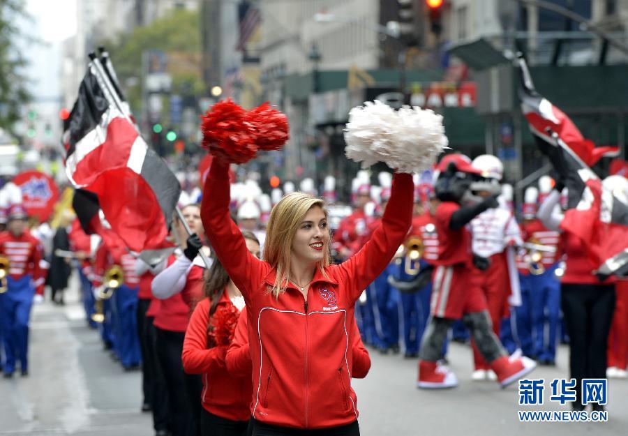 10月13日,来自纽约州立大学石溪分校的大学生们在纽约曼哈顿第五大道参加哥伦布日游行。当日,美国纽约市举行第70届哥伦布日大游行,以纪念意大利航海家克里斯托弗·哥伦布1492年探险远征中首次发现美洲大陆。美国将10月的第二个星期一定为哥伦布日,1792年首次庆祝。纽约市于1929年举办首届哥伦布日游行。新华社记者王雷摄