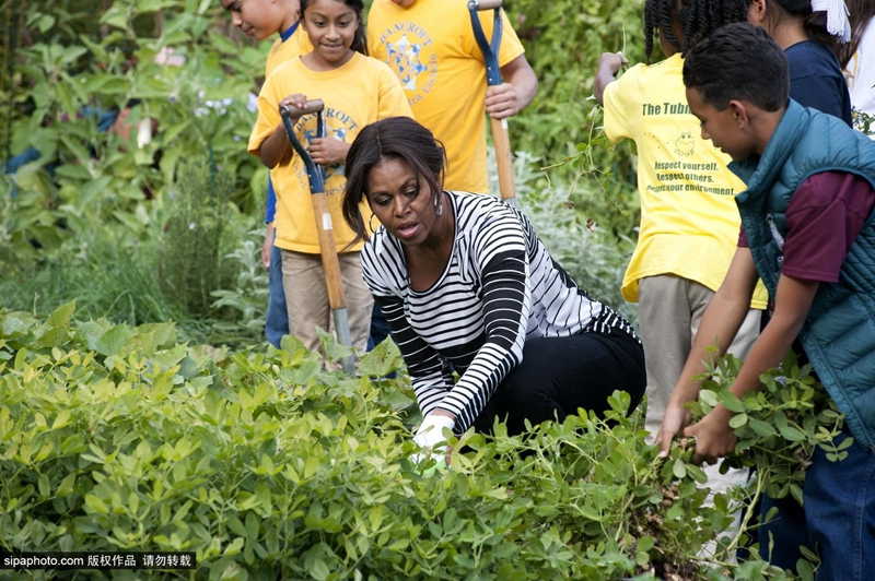 当地时间2014年10月14日,美国华盛顿,美国第一夫人米歇尔与孩子们在白宫花园内举行年度秋天大丰收,劳作完之后一同享用午餐。(图片来源:希帕中国)