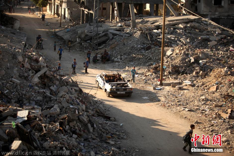 当地时间2014年10月14日,加沙北部拜特汉诺镇,民众开着被毁车辆。联合国秘书长潘基文将访问加沙地区。据巴勒斯坦方面的评估,不久前以色列持续50天的轰炸导致2100人死亡,6万多栋住宅、超5000家企业和商业机构被炸毁或遭到损坏。图片来源:东方IC 版权作品 请勿转载
