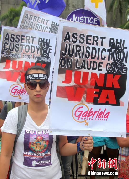 10月15日,菲律宾民众在菲外交部大楼外举行集会,抗议菲律宾政府在美军士兵涉嫌杀害菲国一名变性人事件上对美态度“软弱”。美菲官方此前证实,一名来菲参加军演的美国海军陆战队士兵日前因涉嫌杀害变性人杰弗里?劳德被羁押在美国军舰上接受调查。图为抗议民众在菲外交部前高举标语牌,呼吁为遇害者伸张正义,废除菲美之间的《访问部队协议》(VFA)。中新社发 张明 摄