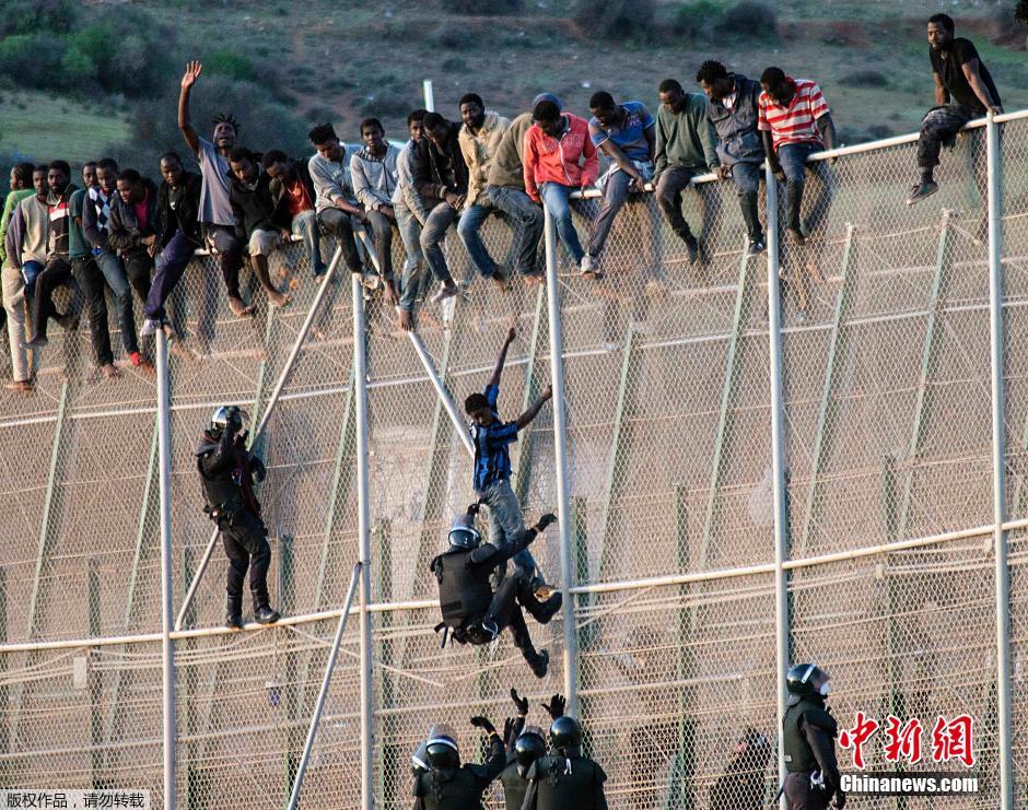 当地时间2014年10月15日,西班牙北非飞地梅利利亚,大约300名移民试图爬过边境墙,进入西班牙境内。部分翻越者被西班牙警卫队逮捕。