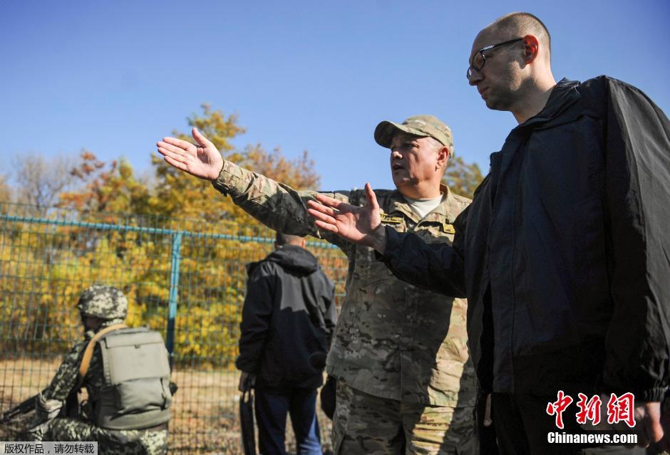 当地时间2014年10月15日,乌克兰哈尔科夫地区,乌克兰总理亚采纽克视察“边境墙”项目。此前,乌政府计划在俄乌边境兴建由防爆围栏组成的“边境墙”,总长60公里,并辅之以1500公里长战壕、大量掩体和防空洞。