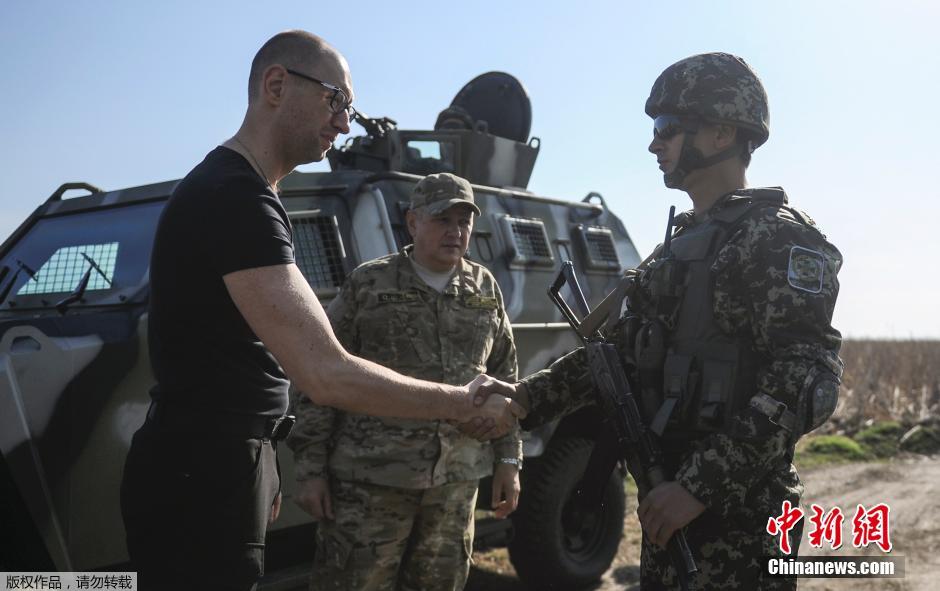 当地时间2014年10月15日,乌克兰哈尔科夫地区,乌克兰总理亚采纽克视察“边境墙”项目。此前,乌政府计划在俄乌边境兴建由防爆围栏组成的“边境墙”,总长60公里,并辅之以1500公里长战壕、大量掩体和防空洞。