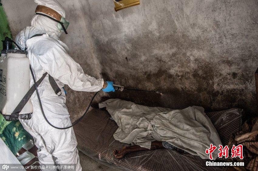 当地时间2014年10月15日,利比里亚首都蒙罗维亚,一支利比里亚红十字会殡仪小组的成员移走了埃博拉疑似患者Mambodou Aliyu的遗体,Mambodou今年仅有35岁。