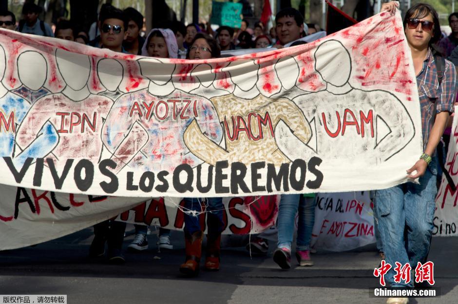 当地时间2014年10月15日,墨西哥格雷罗州州,当地学生举行示威游行,要求找到墨西哥失踪的43名学生。