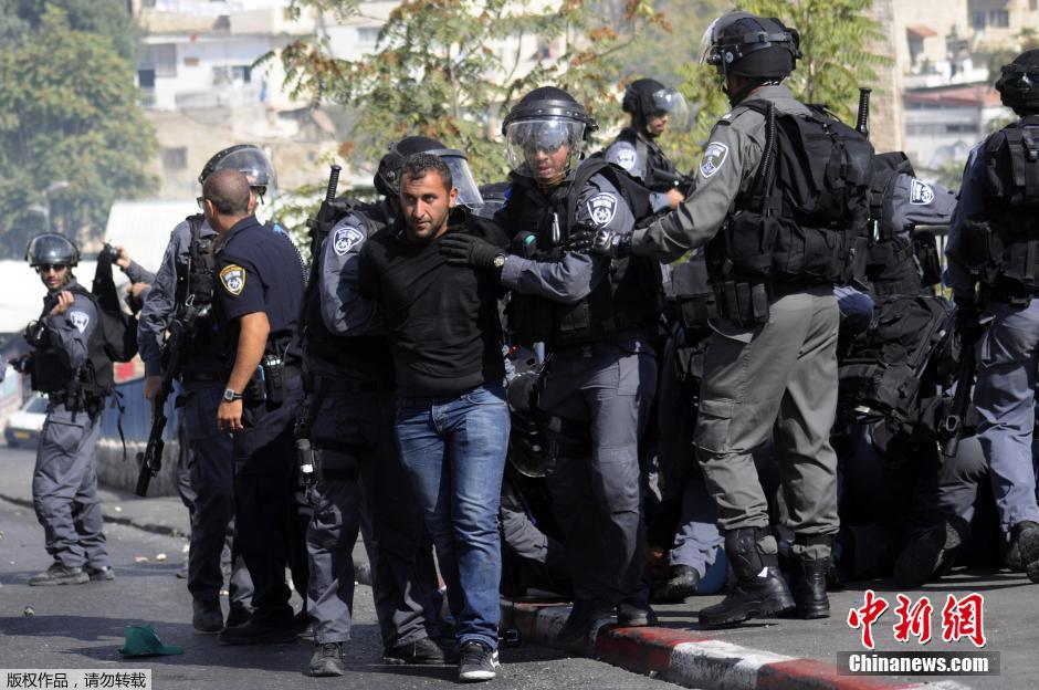 当地时间2014年10月15日,耶路撒冷,巴勒斯坦民众举行示威活动,抗议犹太游客进入圣殿山,并与以色列警察发生激烈冲突,警方逮捕不少示威者。