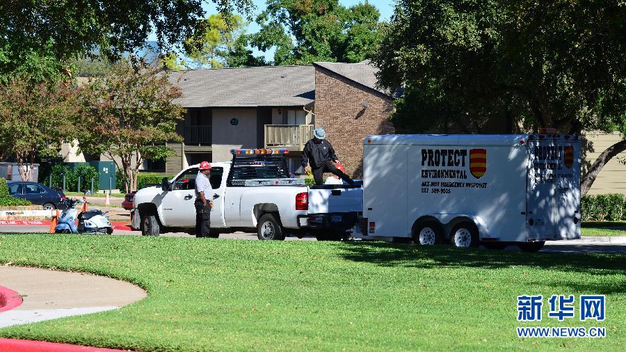 10月15日,在美国达拉斯市,工作人员聚集在埃博拉病毒检测结果呈阳性的医务人员的住所外。美国疾病控制和预防中心15日宣布,继一名女护士之后,又一名医务人员的埃博拉病毒检测结果呈阳性。此人与美国本土发现的首名埃博拉患者有过接触。新华社发(许迅摄)