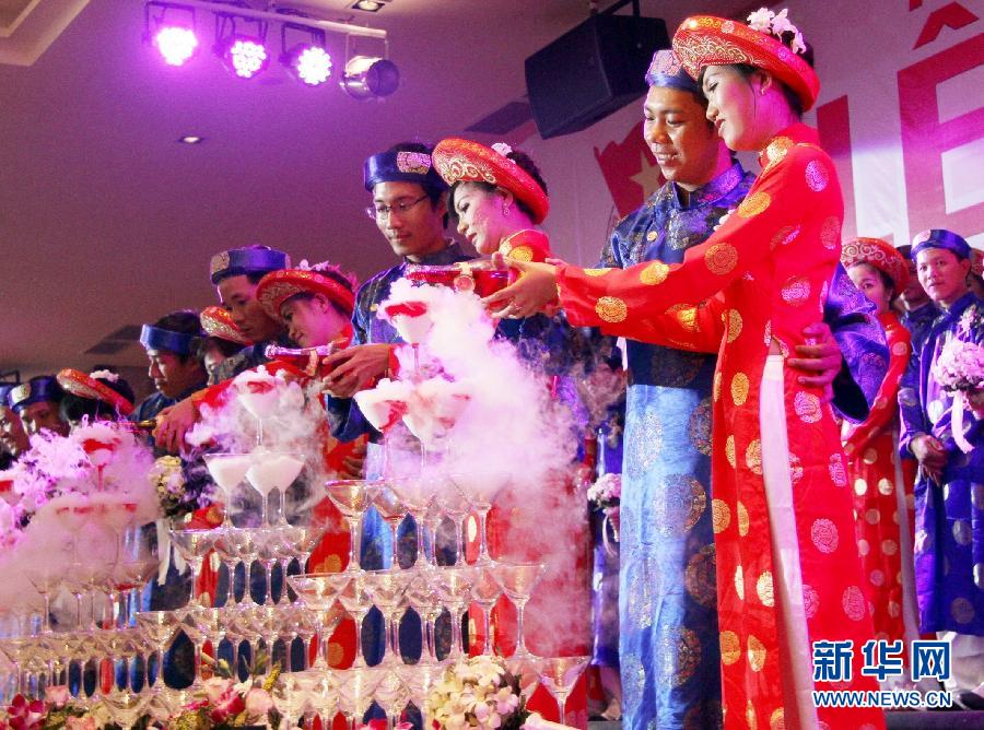 当日,为弘扬越南文化之美、提倡文明节俭的新风尚,共青团胡志明市委在胡志明市举办2014青年工人集体婚礼,共有100对新人参加了这次盛会。新华社发(阮黎暄摄)