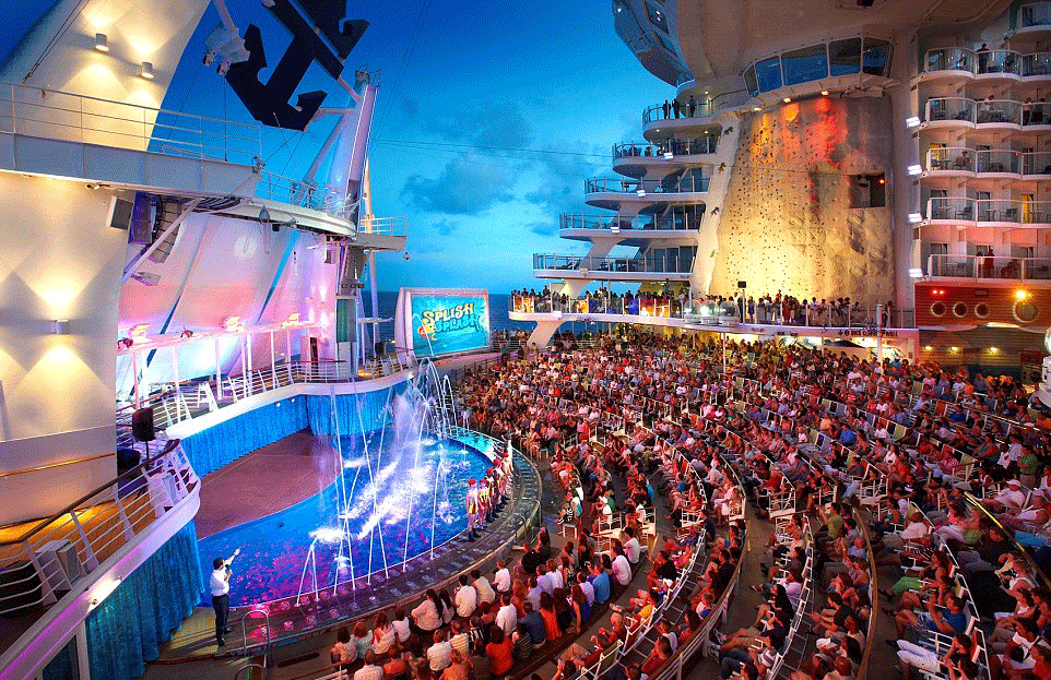“海洋绿洲”号上有可容纳750人的竞技场,还有高台跳水表演场地。(网页截图)