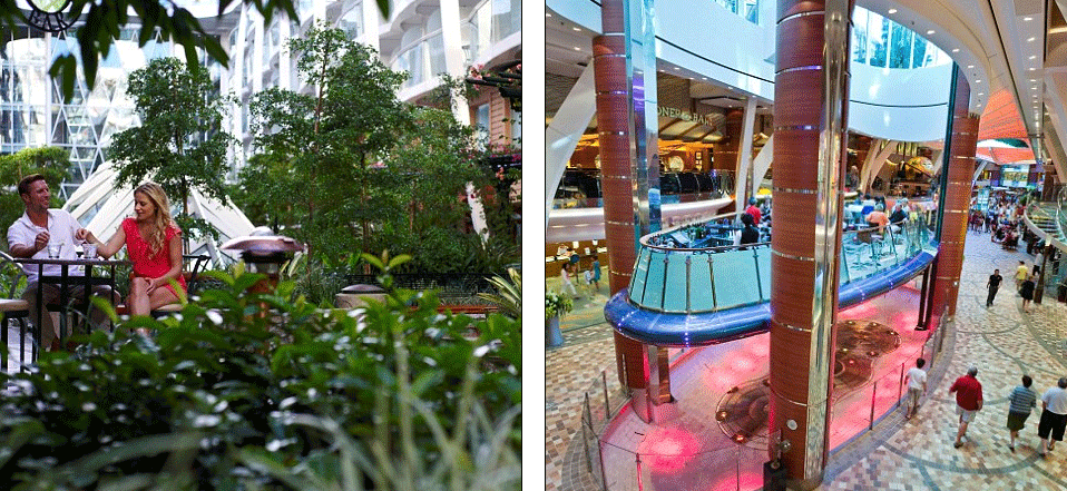 “海洋绿洲”号的户外公园有12000多株真实植物,右图是10000多平方米的零售区。(网页截图)