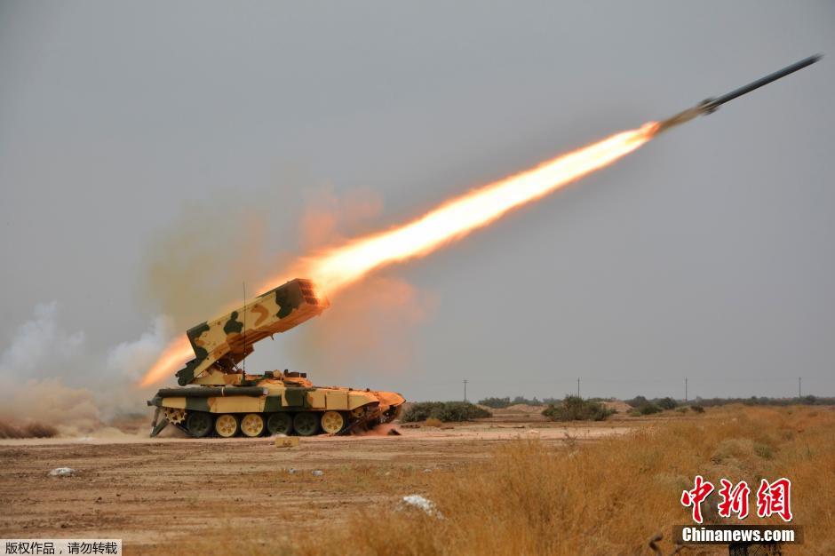 当地时间2014年10月14日,伊拉克巴格达,伊拉克军队士兵利用俄罗斯制造的多管火箭发射器TOS-1A进行军事训练,这架火箭发射器将被运至前线作战。