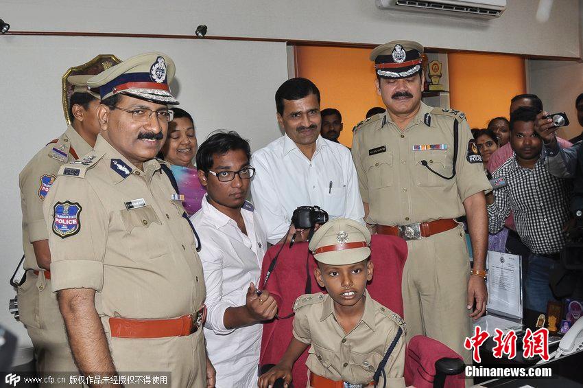 当地时间2014年10月15日,印度海得拉巴,10岁的男孩Mohammad Sadiq在一天的“警察局长”任期内签署文件。来自安得拉邦的数百名警察一起自发帮助身患绝症的10岁男孩实现他的警官梦。10岁的Mohammad Sadiq一只梦想有朝一日成为海得拉巴的警察局长,而在15日这天,他终于梦想成真。身患急性成淋巴细胞性白血病的Sadiq穿上警服,在警察局长的座位上“工作”了一整天。Sadiq得以圆梦还要感谢许愿基金会,这是一个帮助绝症儿童实现临终梦想的志愿组织。 图片来源:CFP视觉中国
