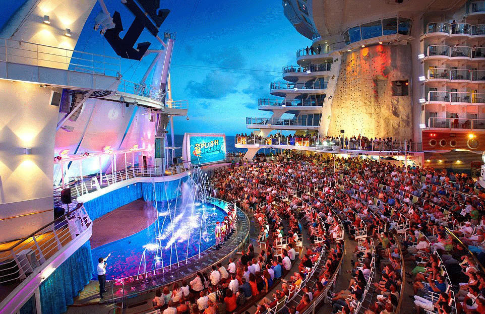 仅给“海洋绿洲”号上漆就用掉63万加仑油漆;“海洋绿洲”号拥有世界上最大的海上游泳池,里面可装2300吨水。其16层甲板户外公园中有12000多株真实植物,包括数百棵棕榈树。为给2700个船舱照明,船上使用电缆长度超过5311公里。“海洋绿洲”号有可容纳750人的竞技场,还有溜冰场、冲浪机、高台跳水表演场地。“海洋绿洲”号上有可容纳750人的竞技场,还有高台跳水表演场地。(网页截图)