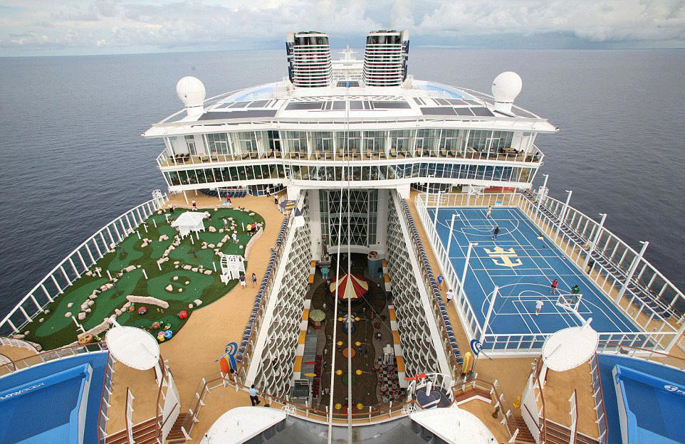 皇家加勒比海国际游轮公司高级副总裁多米尼克·保罗(Dominic Paul)当天表示:“对于皇家加勒比来说,今天是公司全球扩展业务的重要里程碑。我们正对全球市场投资做出重要调整。我们将投资建造新船、开发新技术、提出新理念,增加全世界游轮行业的吸引力。”“海洋绿洲”号上有攀岩墙、篮球场以及迷你高尔夫球场。(网页截图)