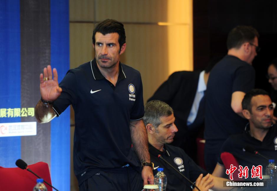 10月16日,由萨内蒂、菲戈、德约卡夫、托尔多等传奇球星领衔的意大利国际米兰传奇明星队造访武汉,作客中意足球传奇明星对抗赛新闻发布会,现场与来自全国各地的国米球迷互动交流。据了解,此次来到武汉的这支球队共由17人组成,他们曾携手为国际米兰摘下意甲、欧洲冠军杯等一系列荣耀,他们将于19日晚在武汉沌口体育中心对阵蔡晟、范志毅、高雷雷以及林强、刘伟等球员组成的湖北老甲A队。图为菲戈亮相与球迷打招呼。中新社发 张畅 摄