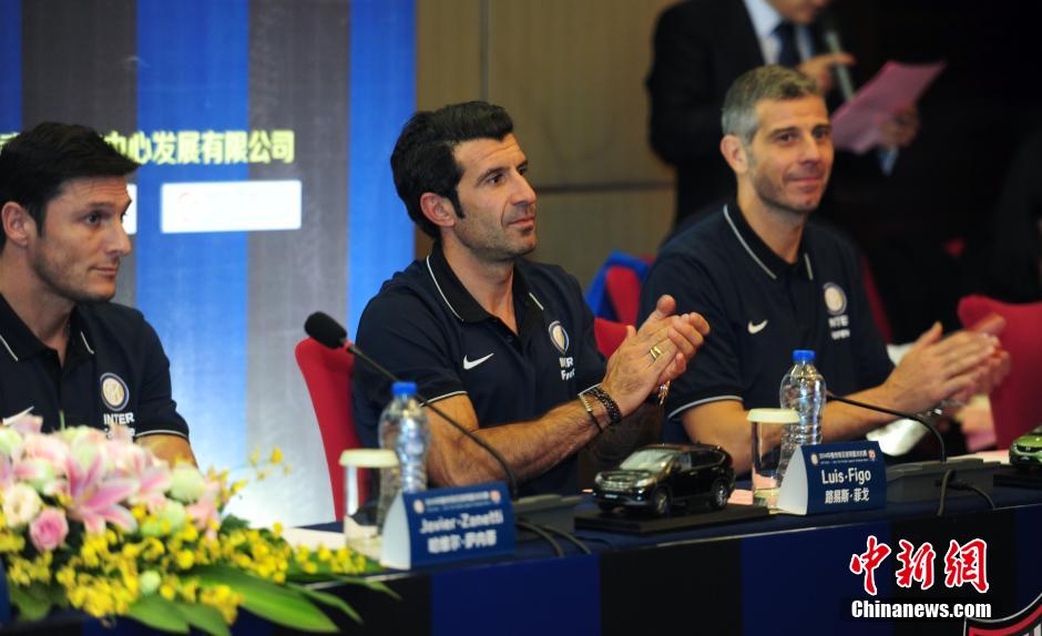 10月16日,由萨内蒂、菲戈、德约卡夫、托尔多等传奇球星领衔的意大利国际米兰传奇明星队造访武汉,作客中意足球传奇明星对抗赛新闻发布会,现场与来自全国各地的国米球迷互动交流。据了解,此次来到武汉的这支球队共由17人组成,他们曾携手为国际米兰摘下意甲、欧洲冠军杯等一系列荣耀,他们将于19日晚在武汉沌口体育中心对阵蔡晟、范志毅、高雷雷以及林强、刘伟等球员组成的湖北老甲A队。图为萨内蒂(左)、菲戈(中)、托尔多(右)与球迷见面。中新社发 张畅 摄