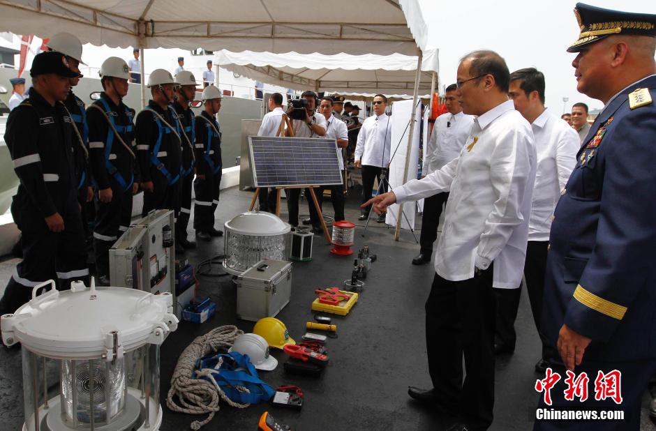10月16日,菲律宾总统阿基诺出席菲海岸警卫队成立113周年庆典。图为阿基诺在查看菲海岸警卫队装备。阿基诺当天在庆典上发表讲话时对菲海岸警卫队的表现大加赞扬。中新社发