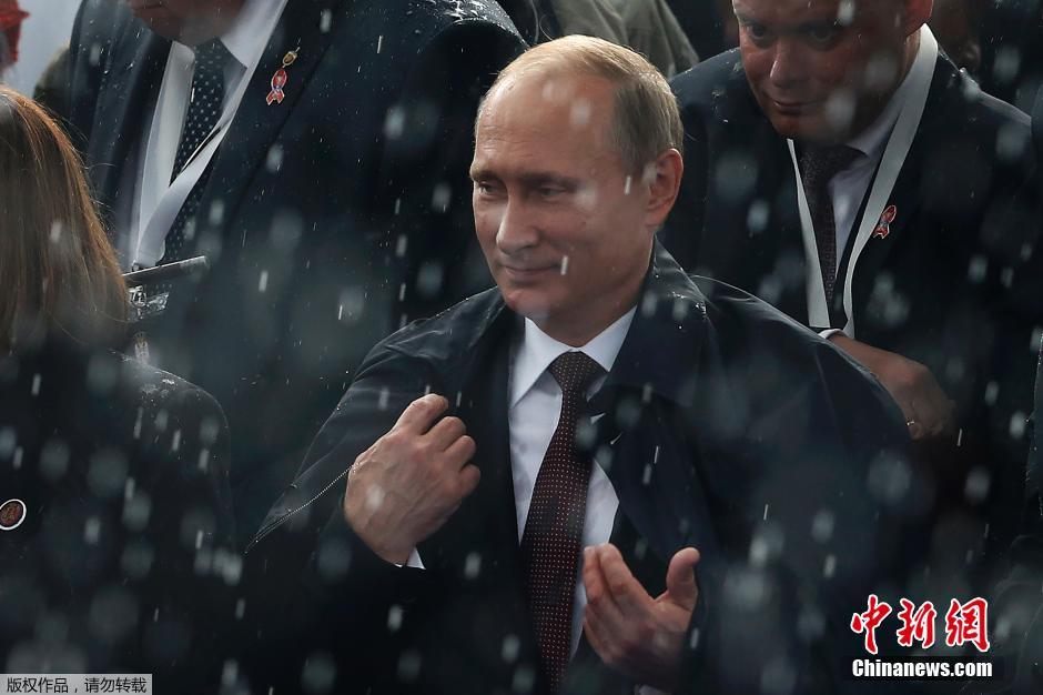 当地时间2014年10月16日,俄罗斯总统普京访问塞尔维亚,冒雨和塞尔维亚总统尼科利奇一同出席庆祝贝尔格莱德独立70周年阅兵仪式。