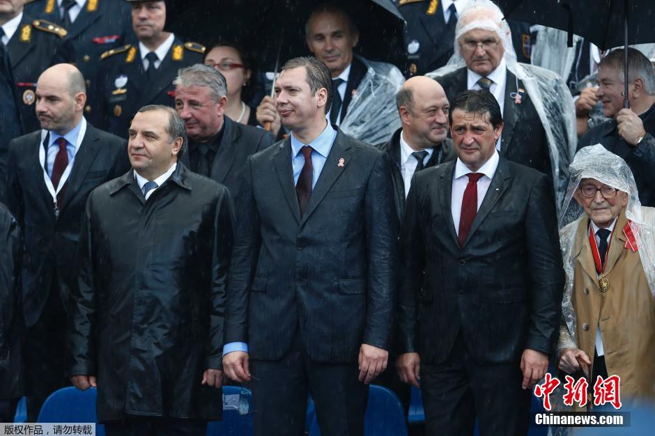 当地时间2014年10月16日,俄罗斯总统普京访问塞尔维亚,冒雨和塞尔维亚总统尼科利奇一同出席庆祝贝尔格莱德独立70周年阅兵仪式。