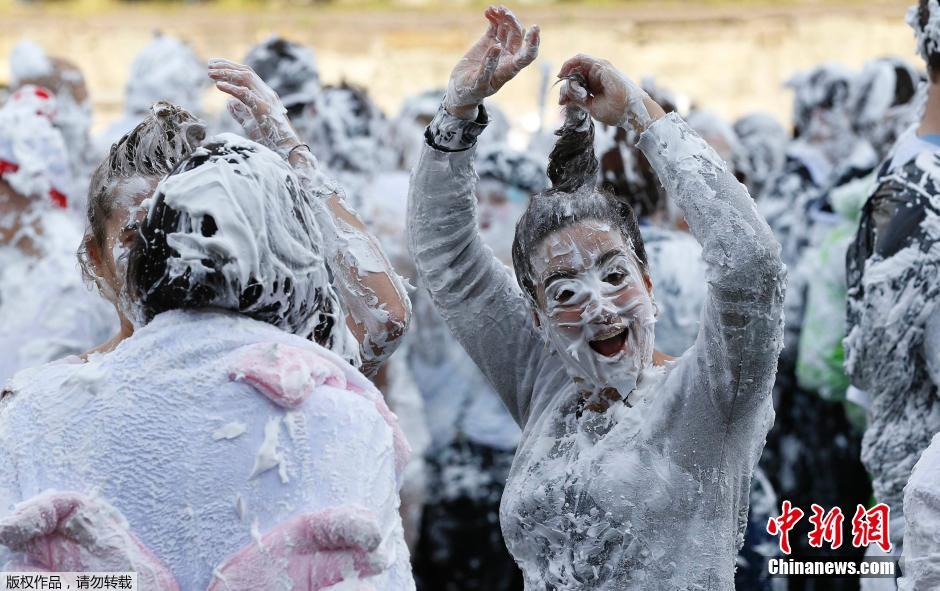 当地时间2014年10月20日,苏格兰圣安德鲁斯大学学生在传统庆典“周一葡萄干”节中进行泡沫大战。这个节日追溯于该校成立伊始,当时每个新生要向高年级学生呈交1磅(454克)的葡萄干,以此对老生帮助他们适应大学生活表示感谢。随着时间的推移,新生们还需向老生索要收取葡萄干的“收据”以作证明。如果没有这份“收据”,则要被按进当地的喷泉中接受处罚。这一习俗演变到今天就变成了热闹非凡的泡沫大战。