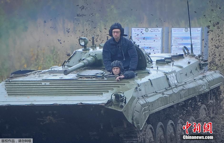 当地时间2014年10月21日,乌克兰总理亚采纽克访问国际维和行动和安全中心,驾驶装甲运兵车。