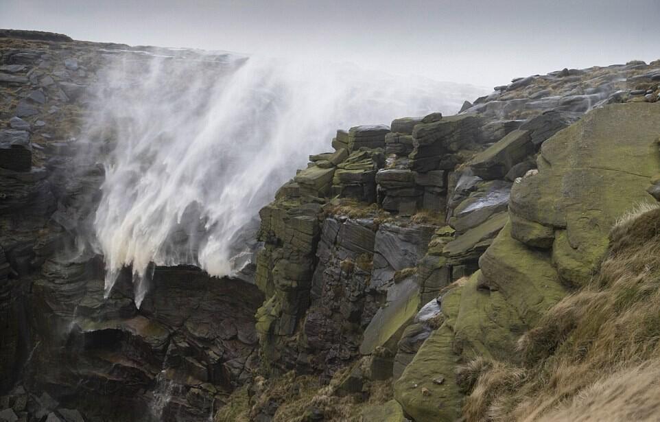 据英国《每日邮报》10月21日报道,飓风“冈萨洛”登陆英国。飓风风力达到每小时70公里,给英国带来连夜暴雨。威尔士全境发出黄色预警。图为英格兰北部一瀑布在强大风力下从山下向上“倒流”。
