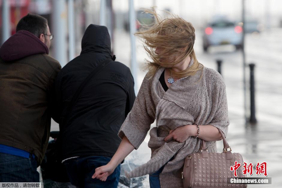 当地时间2014年10月21日,飓风“冈萨洛”来袭,英国多地狂风携巨浪冲上海岸。飓风“冈萨洛”带来连夜的降雨,风力达到每小时70英里,威尔士全境发出黄色预警。图为英国民众在风雨中凌乱前行。