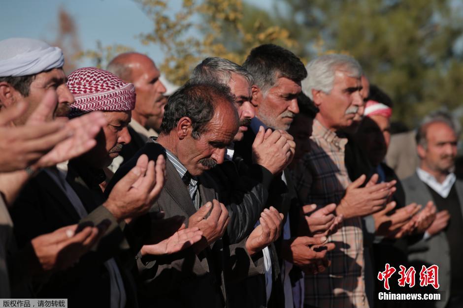 当地时间2014年10月21日,土耳其叙吕奇,库尔德民众为在科巴尼打击极端武装战争中牺牲的三名库尔德战士举行葬礼,他们的亲人并未能被通知到场参加下葬仪式。在战乱中成千上万的库尔德人沦为难民,人们也很难联系上牺牲战士的亲人。