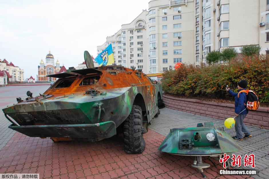 当地时间2014年10月21日,乌克兰基辅,当地民众聚集在一辆废旧的装甲车上,不少孩子已然把装甲车当成了游乐场。据悉,这两武装装甲车是乌克兰内政部缴获所得。