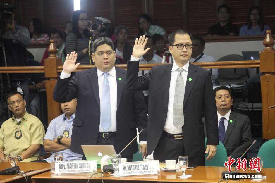 10月22日,菲律宾参议院蓝带小组委员会召开听证会,调查菲国副总统比奈被指涉嫌贪污案。图为被指为菲国副总统比奈家族充当“人头户”的华商林江扬与检举者在听证会上对质。林江扬再度否认充当比奈家族“人头户”代其持有大型农庄。比奈及其家人长期在菲律宾最为富有的城市马卡蒂市主政,积累下深厚政治资本。不过,前马卡蒂市副市长莫卡多近日出面指控比奈一家从市政工程项目中收取回扣,菲参议院随即就相关指控展开调查。 中新社发 张明 摄