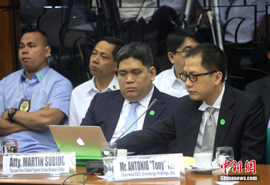 10月22日,菲律宾参议院蓝带小组委员会召开听证会,调查菲国副总统比奈被指涉嫌贪污案。图为被指为菲国副总统比奈家族充当“人头户”的华商林江扬与检举者在听证会上对质。林江扬再度否认充当比奈家族“人头户”代其持有大型农庄。比奈及其家人长期在菲律宾最为富有的城市马卡蒂市主政,积累下深厚政治资本。不过,前马卡蒂市副市长莫卡多近日出面指控比奈一家从市政工程项目中收取回扣,菲参议院随即就相关指控展开调查。 中新社发 张明 摄