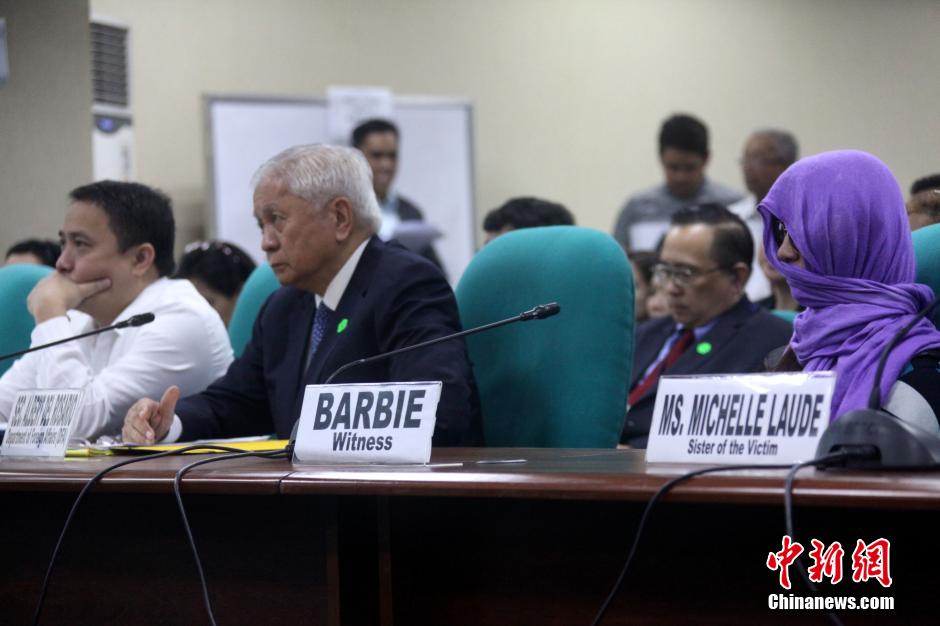 10月22日,菲律宾参议院外交委员会就美军士兵佩伯顿涉嫌杀害菲国变性人杰弗里·劳德案举行听证会。图为菲律宾外交部长德尔罗萨里奥(中)等官员以及该案证人“芭比”出席听证会。原本来菲参加联合军演的美国海军陆战队士兵佩伯顿因涉嫌在菲国一家酒店内杀害26岁的变性人杰弗里·劳德已被羁押。中新社发 张明 摄