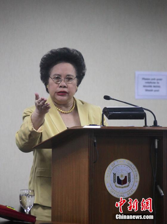 10月22日,菲律宾参议院外交委员会就美军士兵佩伯顿涉嫌杀害菲国变性人杰弗里·劳德案举行听证会。图为菲律宾参议院外交委员会主席、参议员米利亚姆·圣地亚戈在听证会上再次呼吁废除菲律宾与美国之间不平等的《访问部队协议》。菲律宾历史上曾是美国殖民地,菲律宾宪法明文禁止在菲设立外国军事基地、驻扎外国军队或部署外国军事设施,但1998年菲美两国签署《访问部队协议》,准许美军舰船和飞机频频以参加联合军演等名义出入菲律宾。中新社发 张明 摄