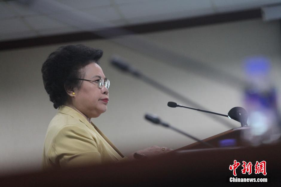 10月22日,菲律宾参议院外交委员会就美军士兵佩伯顿涉嫌杀害菲国变性人杰弗里·劳德案举行听证会。图为菲律宾参议院外交委员会主席、参议员米利亚姆·圣地亚戈在听证会上再次呼吁废除菲律宾与美国之间不平等的《访问部队协议》。菲律宾历史上曾是美国殖民地,菲律宾宪法明文禁止在菲设立外国军事基地、驻扎外国军队或部署外国军事设施,但1998年菲美两国签署《访问部队协议》,准许美军舰船和飞机频频以参加联合军演等名义出入菲律宾。中新社发 张明 摄