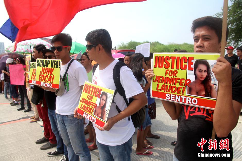 10月22日,大批菲律宾民众在菲首都大马尼拉地区举行集会,为疑遭美军士兵杀害的26岁菲国变性人杰弗里·劳德讨取公道,呼吁废除菲美访问部队协议等不平等协议。图为一名菲律宾民众高举标语牌,要求为遇害的变性人伸张正义。来菲参加联合军演的美国海军陆战队士兵佩伯顿日前因涉嫌杀害26岁的变性人杰弗里·劳德而被羁押,此案引发菲民间连串反美抗议。中新社发 张明 摄