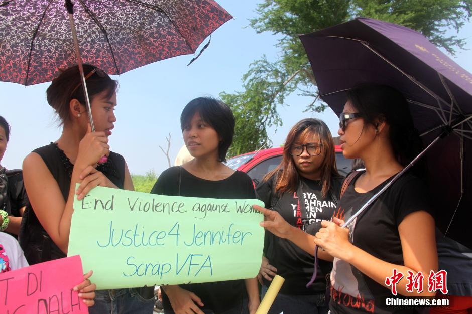 10月22日,大批菲律宾民众在菲首都大马尼拉地区举行集会,为疑遭美军士兵杀害的26岁菲国变性人杰弗里·劳德讨取公道,呼吁废除菲美访问部队协议等不平等协议。图为多名菲律宾女孩带着标语牌参加集会,要求为受害者伸张正义。来菲参加联合军演的美国海军陆战队士兵佩伯顿日前因涉嫌杀害26岁的变性人杰弗里·劳德而被羁押,此案引发菲民间连串反美抗议。中新社发 张明 摄