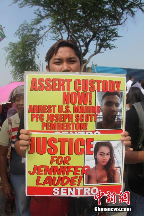 10月22日,大批菲律宾民众在菲首都大马尼拉地区举行集会,为疑遭美军士兵杀害的26岁菲国变性人杰弗里·劳德讨取公道,呼吁废除菲美访问部队协议等不平等协议。图为一名菲律宾民众高举标语牌,要求为遇害的变性人伸张正义,敦促菲当局立即逮捕、羁押涉案美军士兵。来菲参加联合军演的美国海军陆战队士兵佩伯顿日前因涉嫌杀害26岁的变性人杰弗里·劳德而被羁押,此案引发菲民间连串反美抗议。中新社发 张明 摄