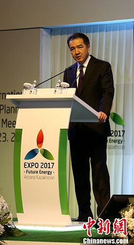图为哈萨克斯坦第一副总理沙金塔乌耶夫(Sagintauev)在大会上发言。 中新社发 王修君 摄